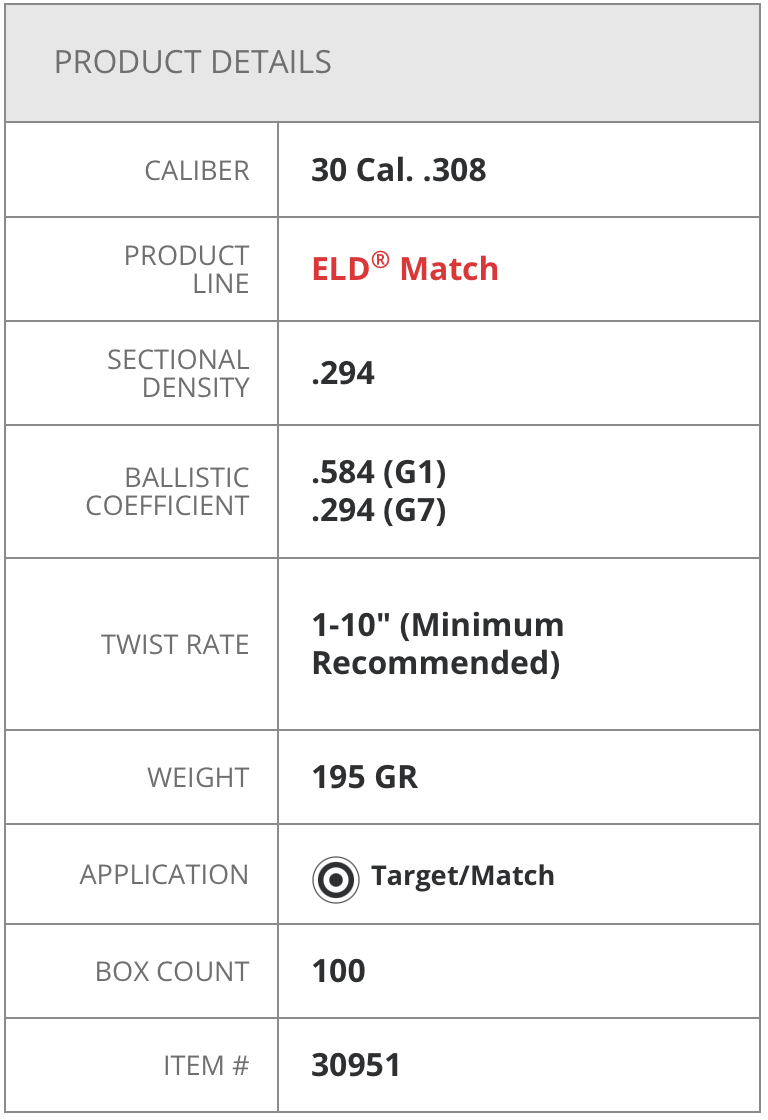 ELD® Match (Extremely Low Drag Match) bullets are technologically advanced, enhanced accuracy target bullets featuring Heat Shield® tips with the PERFECT MEPLAT (tip point) combined with numerous design features that deliver the highest-in-class ballistic coefficients, superior accuracy and extreme consistency from bullet to bullet, lot to lot. Superior accuracy and industry leading ballistic design has been achieved with the ELD Match bullet. An optimum secant ogive and boattail design along with the Heat Shield tip produce a bullet with the highest possible ballistic coefficient in its class.